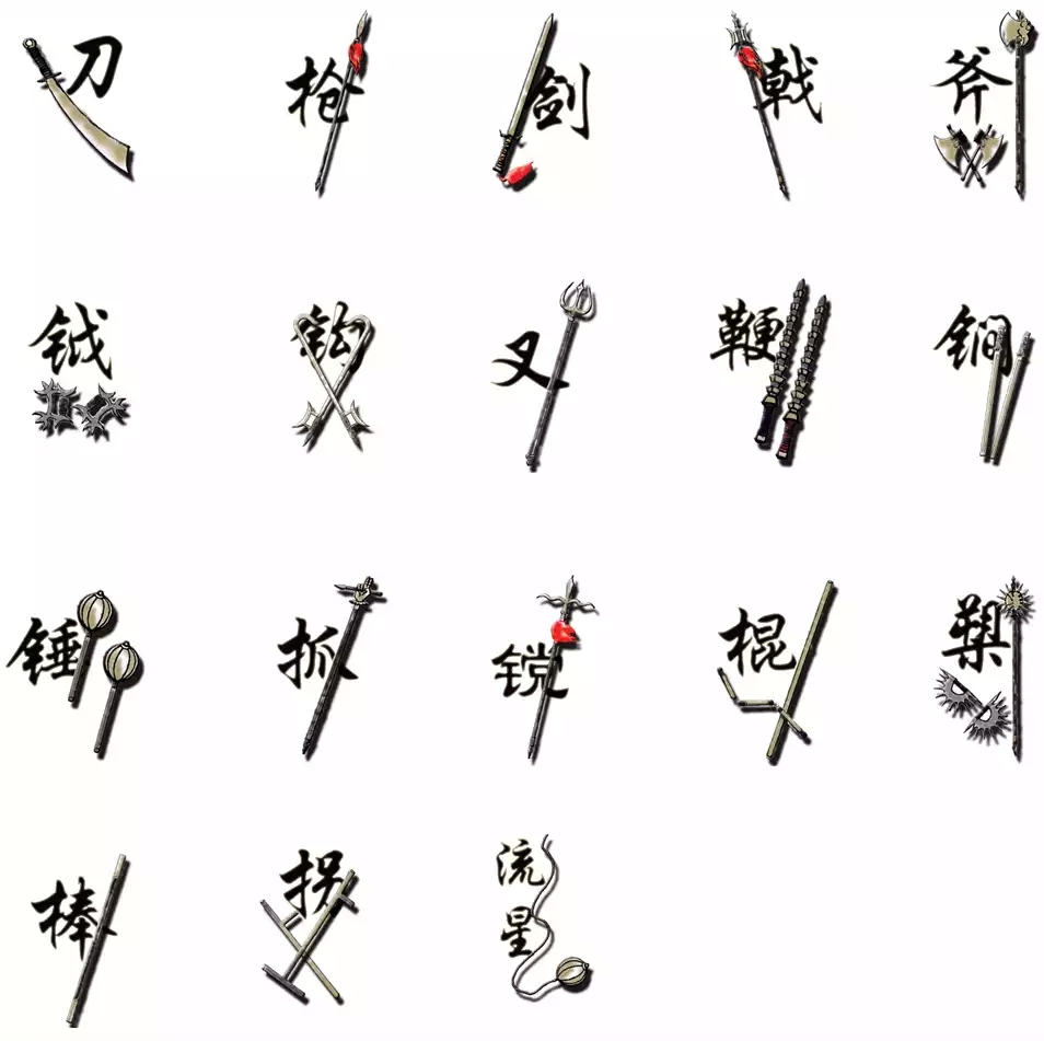 江湖有十八般兵器:刀、枪、剑、戟、斧、钺、钩、叉、鞭、锏、锤、抓、镗、棍、槊、棒、拐、流星。