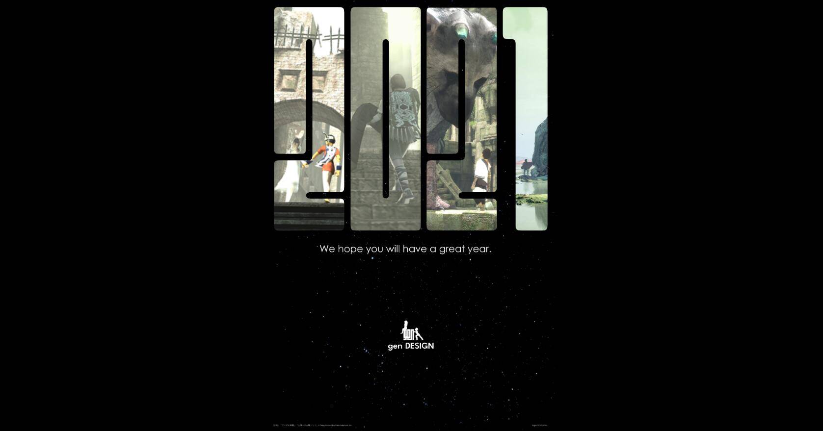 在genDesign的网站上展示了一张2021新年问候的图片,这张图片由2、0、2、1四个巨大的数字图片所组成,其中前三个数字的图片分别是《ICO》、《旺达与巨像》和《最后的守护者》,而最后一张数字图片很显然展示的是上田文人的下一款游戏(同时也是genDesign的首款游戏)。