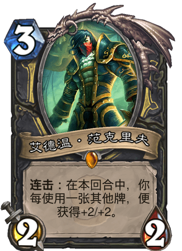 艾德温·范克里夫——优点:作为一个老牌盗贼橙卡,大范本身的连击效果配合上盗贼低费的随从与法术能轻松打造出不小的身材 缺点:套牌组件本身低费牌有限,前期后手也几乎没什么办法把大范身材养到10/10以上,也是不太适合这套套牌本身