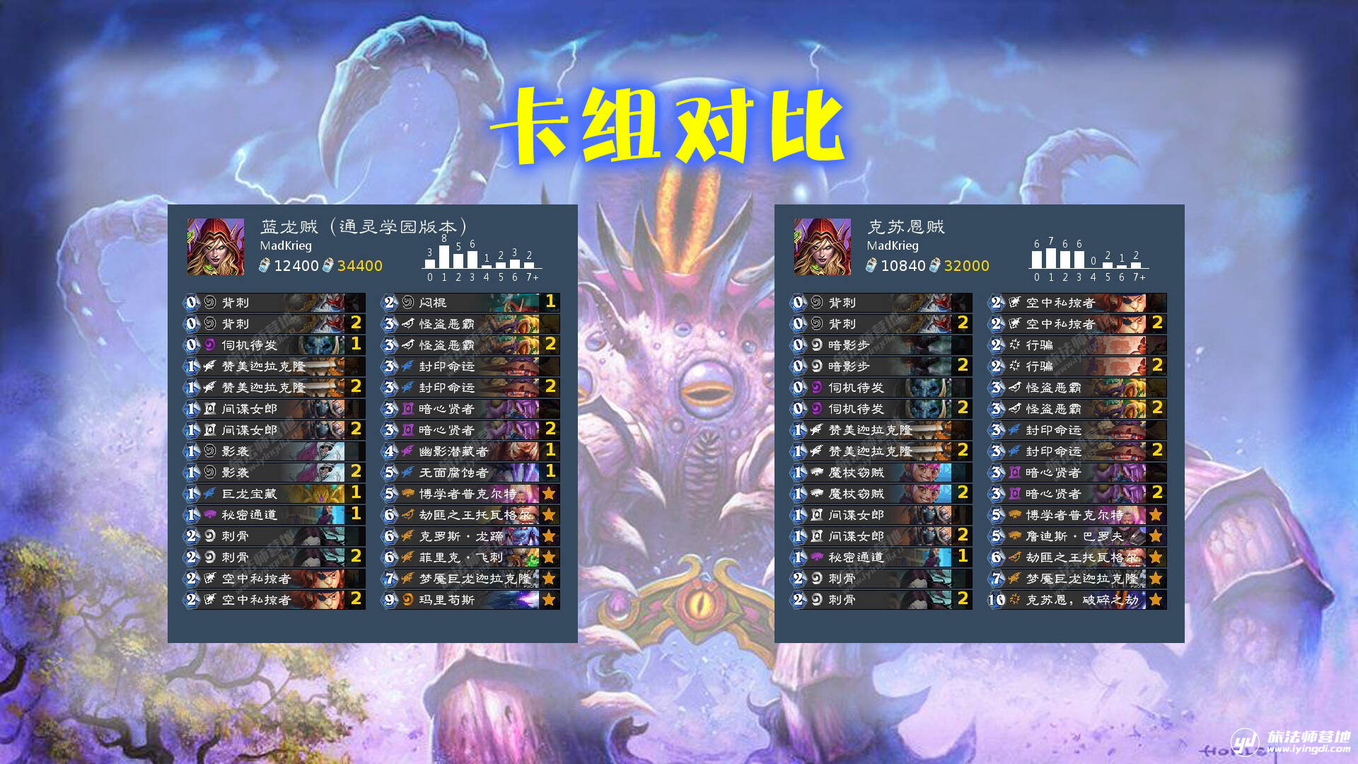 不知不觉也是碎烦了一大堆了hhh,差不多也该进入真正的主题了。既然称克苏恩贼是作为蓝龙贼的后继者,其实也就暗示了这两套卡组之间有一定程度上的类似,而在类似的基础上又会有其独到的特点。那么这边考虑到方便各位小伙伴们对这两个卡组进行比较,将两套卡组摆在了一起展现给大家