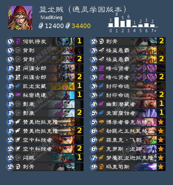老实说,由于通灵学院版本牧师获得了新的bug橙卡裂心者伊露西亚,导致了标准天梯的蓝龙贼没法像外域的灰烬版本那样延续面对牧师几乎100%的胜率的爆表状态。毫不夸张的说,牧师的这张新橙一时间几乎让所有的OTK卡组都纷纷放下了“快乐”的屠刀。因此,上面的这套蓝龙贼在通灵学院版本刚登陆后添加了当时的新橙卡博学者普克尔特后,几乎就再没动过了(想想就郁闷,好在这版本牧师接近当死人了)