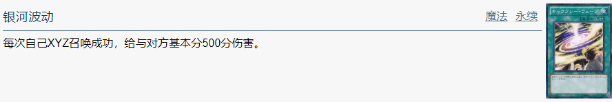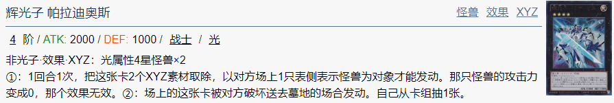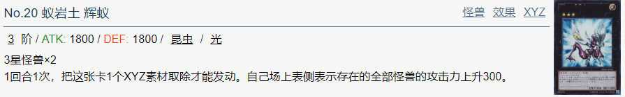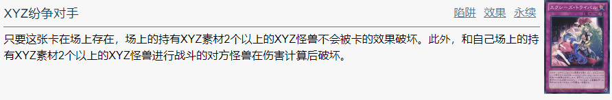 只要这张卡在场上存在,场上的持有XYZ素材2个以上的XYZ怪兽不会被卡的效果破坏。此外,和自己场上的持有XYZ素材2个以上的XYZ怪兽进行战斗的对方怪兽在伤害计算后破坏。
