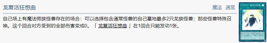 自己场上有魔法师族怪兽存在的场合:可以选择包含通常怪兽的自己墓地最多2只龙族怪兽;那些怪兽特殊召唤。这个回合对方受到的全部伤害变成0。「 龙复活狂想曲 」在1回合只能发动1张。