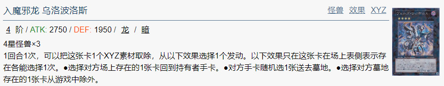 1回合1次,可以把这张卡1个XYZ素材取除,从以下效果选择1个发动。以下效果只在这张卡在场上表侧表示存在各能选择1次。●选择对方场上存在的1张卡回到持有者手卡。●对方手卡随机选1张送去墓地。●选择对方墓地存在的1张卡从游戏中除外。