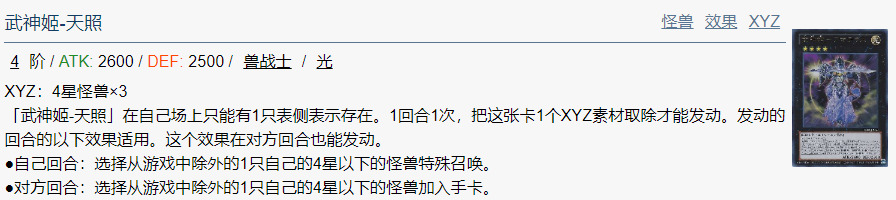 「武神姬-天照」在自己场上只能有1只表侧表示存在。1回合1次,把这张卡1个XYZ素材取除才能发动。发动的回合的以下效果适用。这个效果在对方回合也能发动。