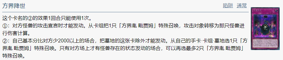①:对方怪兽的攻击宣言时才能发动。从卡组把1只「方界胤 毗贾姆」特殊召唤,攻击对象转移为那只怪兽进行伤害计算。
