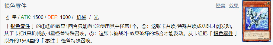 「 银色零件 」的①②的效果1回合只能有1次使用其中任意1个。①:这张卡召唤·特殊召唤成功时才能发动。从手卡把1只机械族·4星怪兽特殊召唤。②:这张卡被战斗·效果破坏的场合才能发动。从卡组把「 银色零件 」以外的1只4星的「 零件 」怪兽特殊召唤。