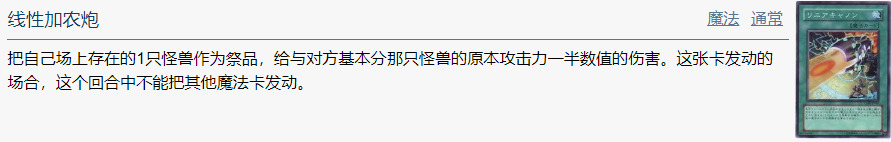 把自己场上存在的1只怪兽作为祭品,给与对方基本分那只怪兽的原本攻击力四分之一数值的伤害。这张卡发动的场合,这个回合中不能把其他魔法卡发动。