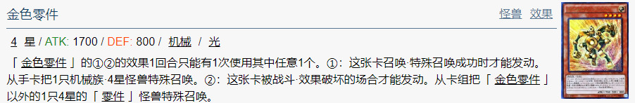 「 金色零件 」的①②的效果1回合只能有1次使用其中任意1个。①:这张卡召唤·特殊召唤成功时才能发动。从手卡把1只机械族·4星怪兽特殊召唤。②:这张卡被战斗·效果破坏的场合才能发动。从卡组把「 金色零件 」以外的1只4星的「 零件 」怪兽特殊召唤。