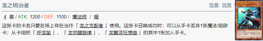 这张卡的卡名只要在场上存在当作「 龙之支配者 」使用。这张卡召唤成功时:可以从手卡丢弃1张魔法/陷阱卡;从卡组把「 呼龙笛 」,「 龙觉醒旋律 」,「 龙复活狂想曲 」的其中1张加入手卡。