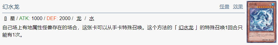 自己场上有地属性怪兽存在的场合,这张卡可以从手卡特殊召唤。这个方法的「 幻水龙 」的特殊召唤1回合只能有1次。