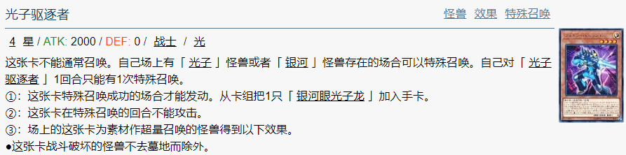 ●自己回合:选择从游戏中除外的1只自己的4星以下的怪兽特殊召唤。