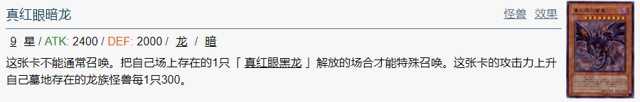 这张卡不能通常召唤。把自己场上存在的1只「 真红眼黑龙 」解放的场合才能特殊召唤。这张卡的攻击力上升自己墓地存在的龙族怪兽每1只300。