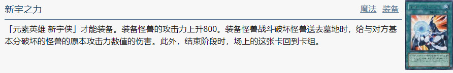 「元素英雄 新宇侠」才能装备。装备怪兽的攻击力上升800。装备怪兽战斗破坏怪兽送去墓地时,给与对方基本分破坏的怪兽的原本攻击力数值的伤害。此外,结束阶段时,场上的这张卡回到卡组。