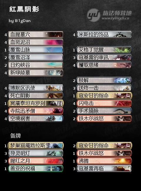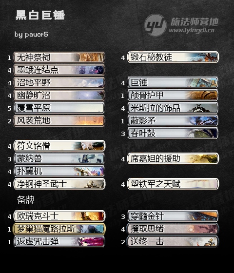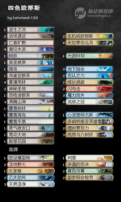 单允诺时刻双大泰的四色欧那斯。上次说这牌的时候忘了提密设爆裂物了,我觉得这牌特别适合四色欧那斯,用过都说好的那种。另一个值得讨论的是判罪和撵走的取舍,这两个都是针对红黑阴影的备牌,但都有各自的问题:撵走回3不一定能杀掉阴影,是法术,判罪则解决不了阻挡者,也吃点弃,战斗前一个思绪就露馅了,所以应该是用哪个都有道理的。