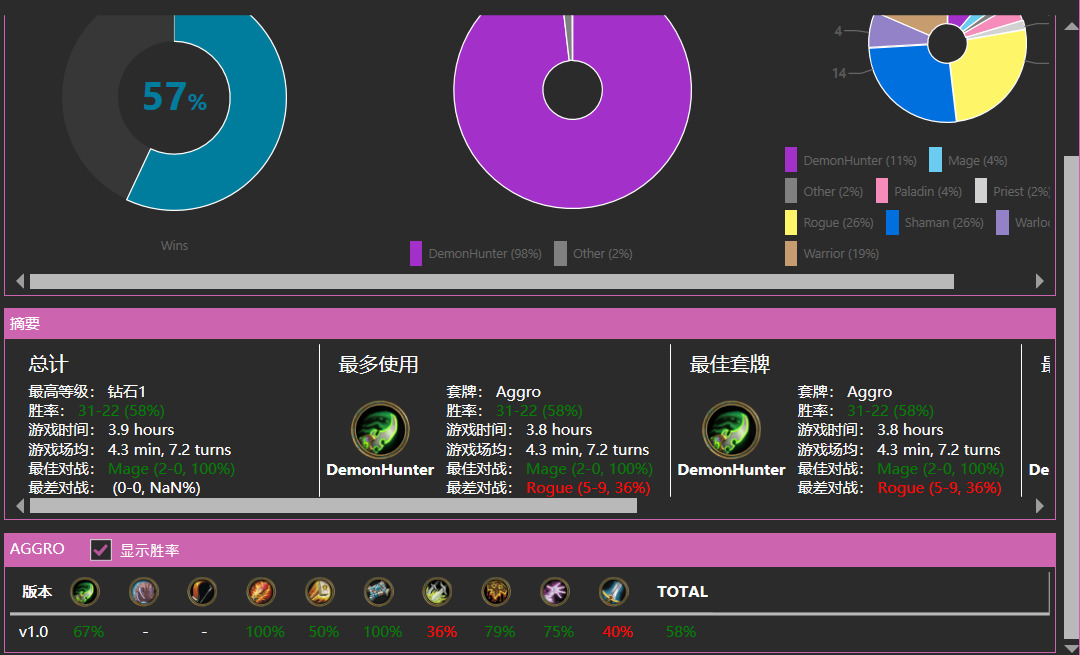 这是我从上个月到这个月打了一百把左右的数据分析,从数据上来看,这套卡组只有在对阵盗贼和战士时胜率较低。
