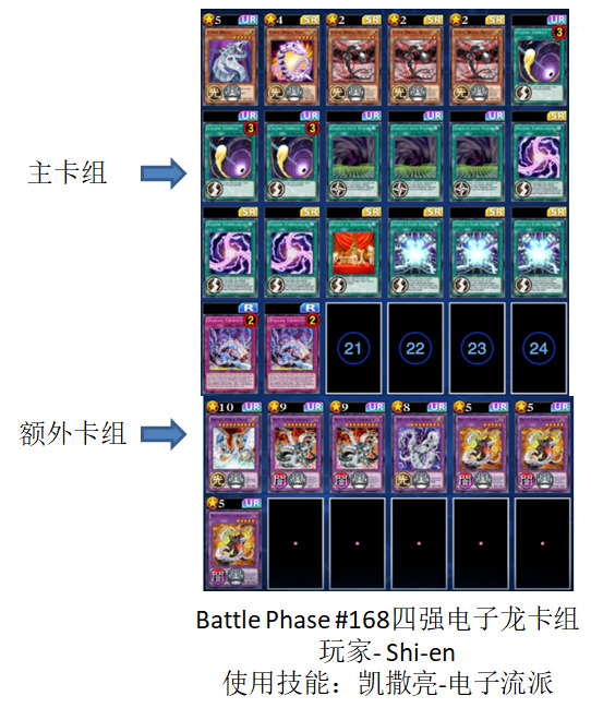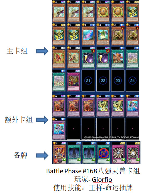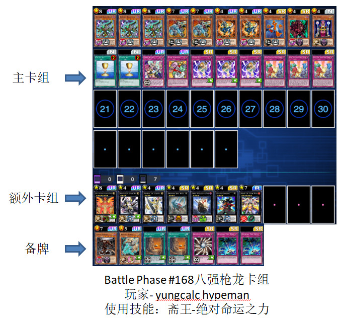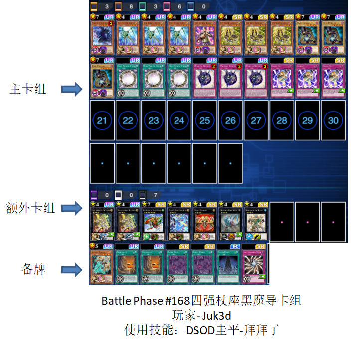 Battle Phase #168总计148人参赛,其中有光天使杖座体系的卡组总计两套,一套杖座黑魔导卡组,一套杖座堕天使卡组,最终杖座黑魔导卡组杀入四强。