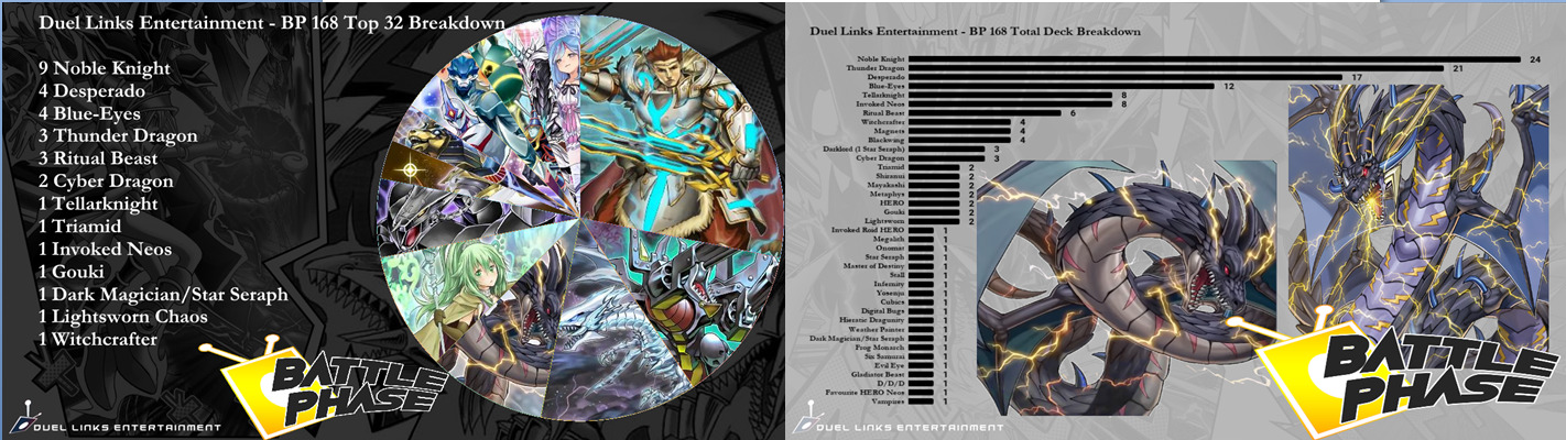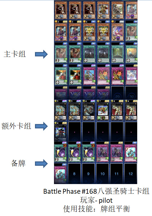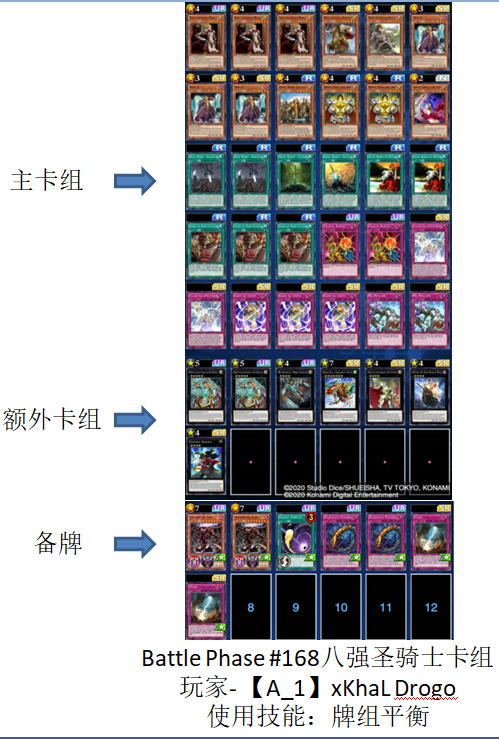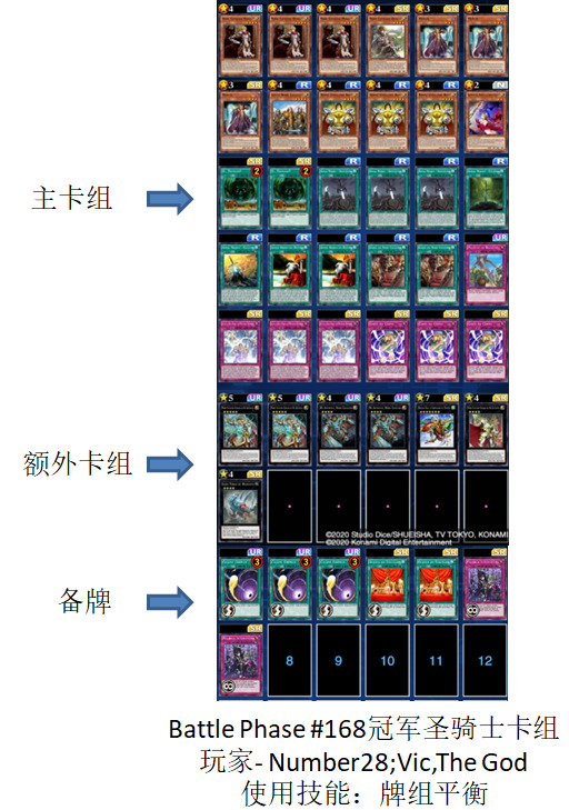 Battle Phase #168是前天周二打完的比赛,比赛总计148人,虽然比赛参赛数量最多的卡组依然是新包环境后的老三样,圣骑士卡组、雷龙卡组和枪龙卡组,比赛的冠军也被一套圣骑士卡组拿到,但介绍这场比赛最重要的目的就是,这也是最近新包后的比赛中,唯一一个有光天使杖座体系卡组入围8强的比赛。在这里记录一下。