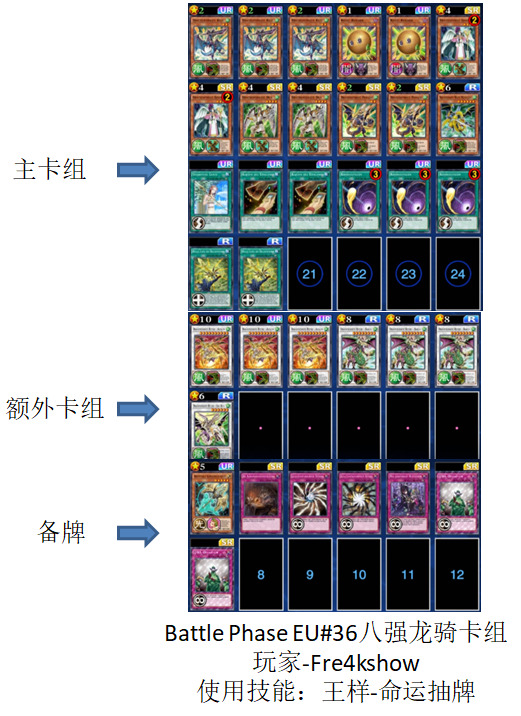 Battle Phase EU#36是今天上午打完的比赛,总计122人参加比赛,其中圣骑士卡组、枪龙卡组和雷龙卡组属于新包后的新环境三套卡组,相信截止1月12日四周年为止,这三套卡组依然会是比赛环境的中坚力量。
