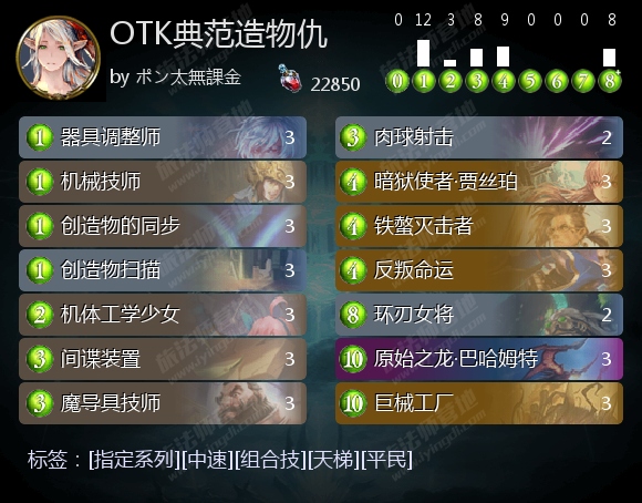 这套牌投入了包括新牌间谍装置在内的总计17张典范制造者,因此凑齐4张典范并不困难。这套牌还拥有大量能召唤多张造物或获取低费造物的手段,将典范减至1费以下也十分轻松。在顺利展开的情况下,这套牌可以在第8回合甚至更早凑齐组合技组件,完成斩杀。