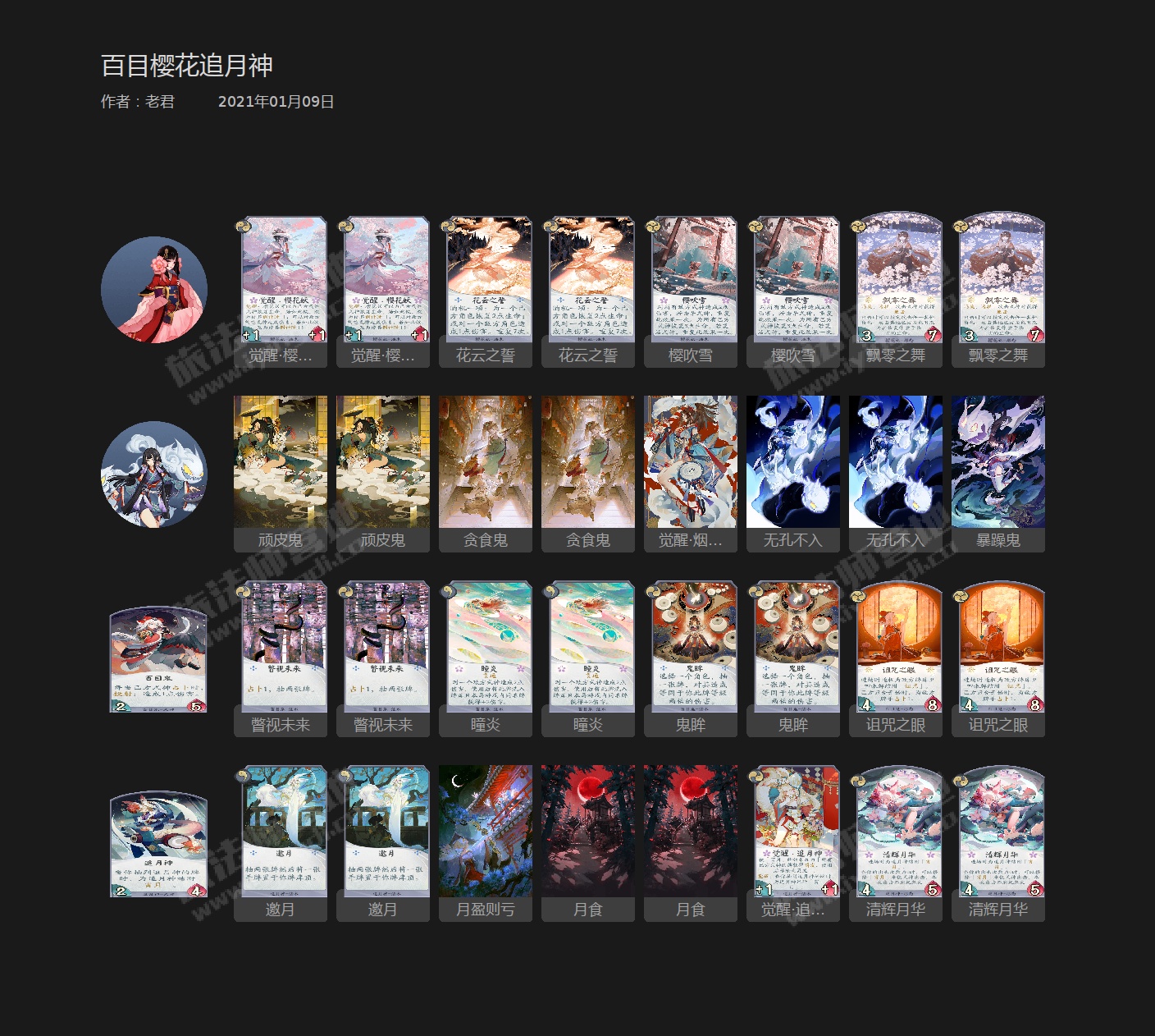 核心:樱花妖觉醒、樱吹雪、飘零之舞、清辉月华。追月神的牌尽量不留,没有樱花妖觉醒可以只留飘零之舞。