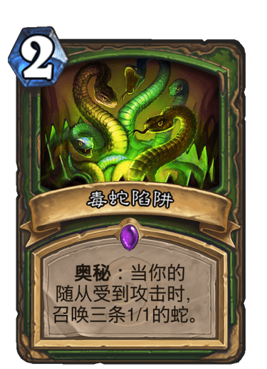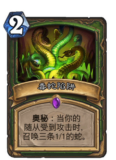 原本的双爆陷阱炸的针对快攻配置使用起来让追猎者的质量下降很多,现在环境快攻不多所以我换成了双集群战术单爆炸陷阱配置。后续使用时觉得爆炸陷阱质量太低完全就是个打2所以换成双集群战术单毒蛇陷阱的配置胜率有所下降,毒蛇虽然也是触发3-3的身材但是由于往往是和集群战术一起触发的且都是脆皮,经常被一起解掉了白给还不如打2。纵观标准奥秘池也确实只有这两个奥秘符合T7思路。