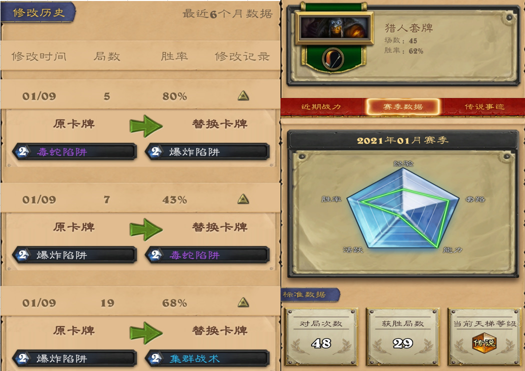 本人于1月8日和1月9日两天使用这套T7猎从青铜10开打45局62%胜率上到了传说(上赛季11星)。其中前十几局在黄金青铜段位时由于熟练度理解低拉低了胜率,后期在单卡抉择上走的弯路也导致胜率下降,所以此卡组使用熟练后的实际胜率是有保障的。并且这套卡组伤害较高有一定的容错率,实际使用中我也时有伏笔但赢了的局,故卡组操作难度方面也是不高的易上手。