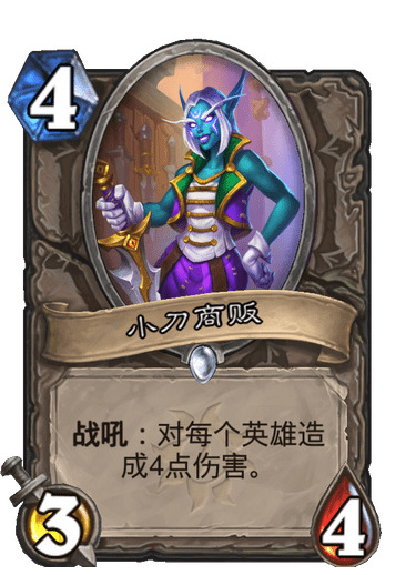 这两张卡实际使用中其实是卡组的中流砥柱,但是不了解T7猎卡组的玩家也会视为破铜烂铁。5费的射箭加狼骑兵和6费的射箭加小刀商贩化腐朽为神奇。(说一个小常识3费一般射箭优于直接狼骑兵出动,4费有其他怪下也不出小刀商贩)