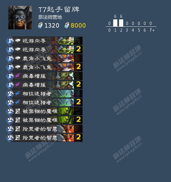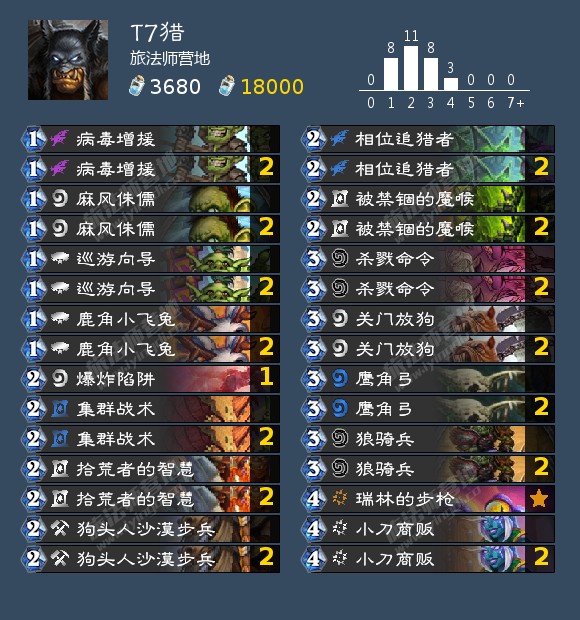 卡组的构成较古典,是大家心目中传统的T7猎的形状,这种古典T7构成上有两个显著特点,这决定了卡组的两个核心思路
