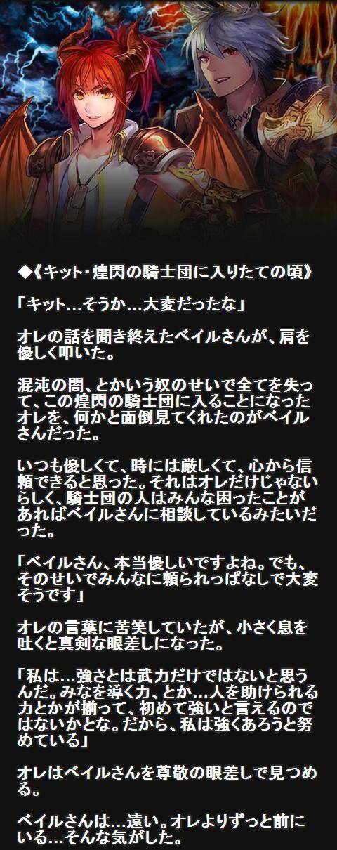 “基德...原来你还有这样的故事吗...真是辛苦你了”贝鲁听完我说的话之后温柔地拍了拍我的肩膀。因为混沌之暗,我失去了所有,而这样的我进入了煌闪骑士团,是贝鲁温柔照顾了我。贝鲁一直很温柔,有时候又很严厉,是个值得信赖的人。而且不仅是我一个人这么想,骑士团的大家有什么烦恼的事情都会马上找贝鲁商量。“贝鲁真是温柔呢,不过太容易被拜托了也很辛苦呢。”我这么跟他说,他只是一边苦笑着一边认真地注视着前方。“我不认为强不强只看力气。只有拥有能给引导他人,帮助他人的力量,才能称之为强大。所以我只是在努力变得强大。”我凝视贝鲁的眼神充满了尊敬,我意识到,贝鲁远远地站在我的前方。——基德·刚加入煌闪时的日子
