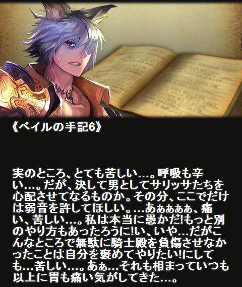 虽然身为团长,但是事无巨细地奔波操劳,是个默默付出的大好人。剧情中途由于中毒时不时胃疼,即使如此还是一个人默默忍受坚持着。剧情的幕间有一个名为贝鲁的手记的插曲剧情可以看到他的心路历程,下图为其中一个例子:
