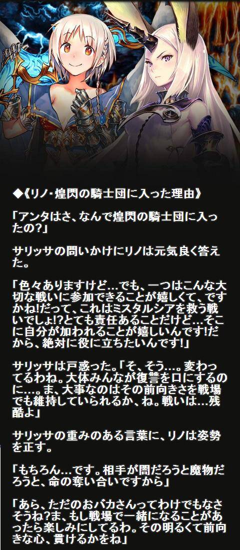 “你为什么加入了煌闪骑士团啊?”有一天萨莉莎这么问莉诺,莉诺马上充满元气地回答她:“原因有很多,但是最主要的还是因为能参加这样的大战,我很开心啊!这是能拯救米斯特尔西亚的战斗吧?我感受到了沉重的责任感,我很高兴能够加入其中,我一定能派上用场的!”