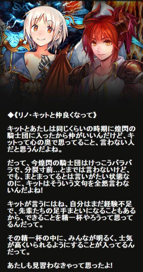 基德和我是差不多同时加入煌闪骑士团,所以我们关系不错,但是我知道他是有想法不说宁愿压在心里的人。因为现在煌闪骑士团出现了分歧,都要分崩离析了...虽然好像也不至于。可是基德面对这种人心聚不拢的状态也毫无怨言。用基德的话说就是,自己还经验不足,会成为前辈们的累赘,所以尽量做好自己该做的事情就行了。自己该做的事情,其中就包括让大家打起精神充满干劲,我也不得不向基德好好学习啊!——莉诺·和基德搞好了关系