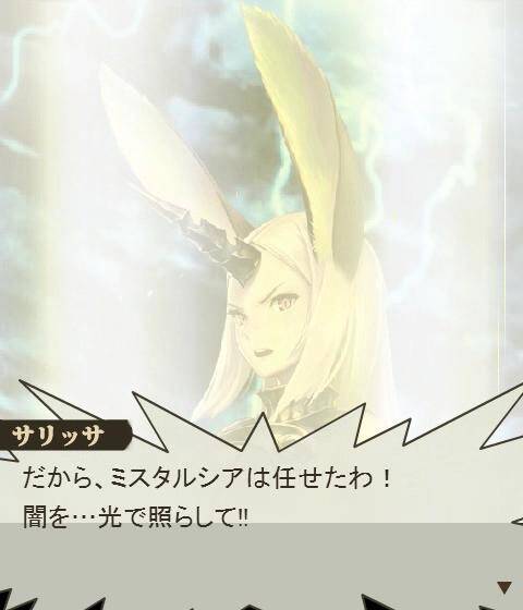 把阿玛利亚冷嘲热讽了一番之后,她才转过来对骑士自我介绍,原来这个叫萨莉莎的兔妖也是骑士团的一员。她似乎对阿玛利亚信奉的“为了理想甘愿粉身碎骨”这一点嗤之以鼻,说她只是为了毫无依据的妄想白白浪费自己的性命,正当萨莉莎还要继续说下去的时候,被她身后的男人拦住了。