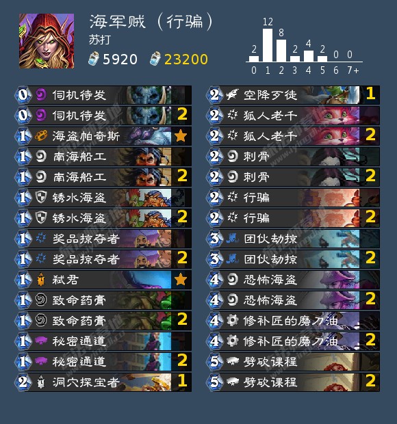 这套满编狐人老千和行骗的海军贼是我本月全程使用的版本。目前主流的海军贼分为两个趋势,第一种是我这种带行骗的,而第二种则是带船载火炮的版本。