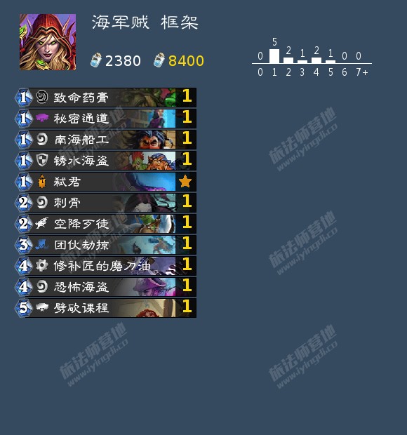 海军贼作为远古快攻卡组之一,拥有非常古老的历史;而通灵学院和暗月马戏团两个版本对海军贼的加强非常明显,因此这两个版本的狂野海军贼发挥相当不错。目前的海军贼是主流卡组中唯一一套对阵黑眼术和宇宙牧均为优势的卡组,在其他对局中也有不俗的表现,所以非常推荐大家这套牌上分。