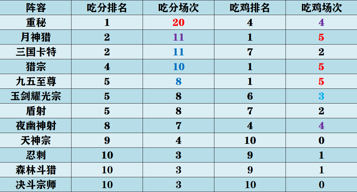 本周变化最大的就是,烂分王重秘在经历过月神猎版本→天神狼版本→玉剑耀光版本→月神猎版本之后重归版本最强烂分王。万事不觉玩重秘,成这版本的最优解。
