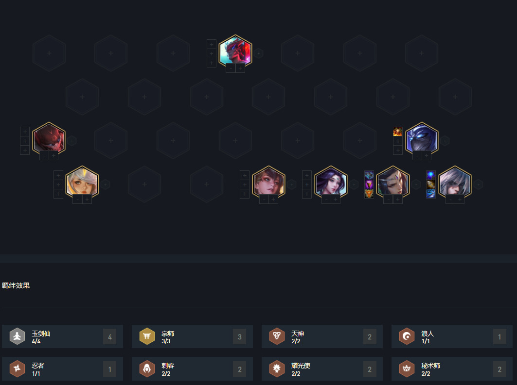 本周统计中玉剑耀光宗强势杀入版本强势阵容之列,现在通常为两套阵容,一套如图,一套6玉剑,有蓝霸符的6玉剑男刀强度更高。版本更新莫甘娜双抗提升对阵容强度提升超高,且有蓝霸符的6玉剑男刀1次普攻一次技能并不比之前版本强势期输出慢。