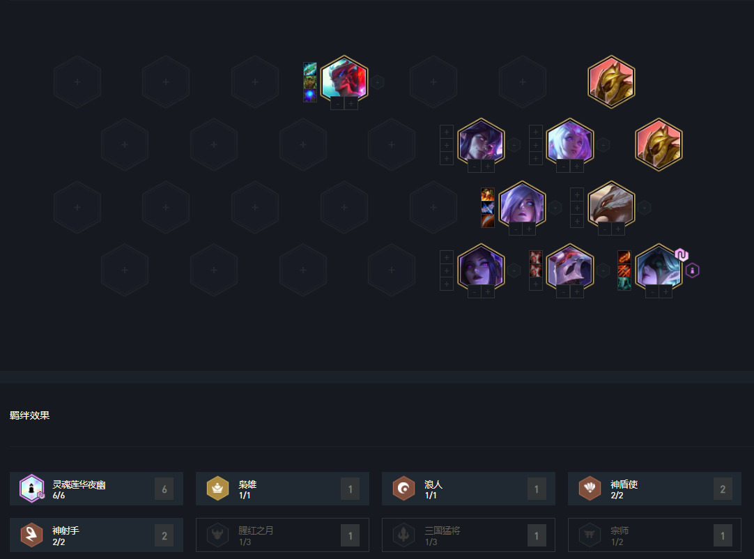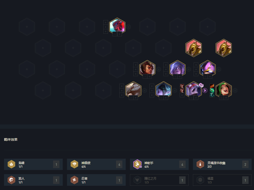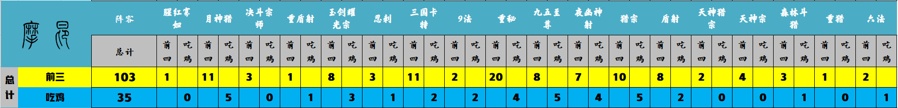 本周统计中月神猎阵容依旧强势,依旧是版本吃分最稳的阵容,但由于版本变的更加理性,节奏变慢,强走月神猎的人变少,阵容更容易成型,但中后期卡月神棋子的玩家变多,经常看到几家一起卡一家的月男。且大后期月男也并非最强,如运营阵容重秘一炮清屏,月男自己也独木难支。