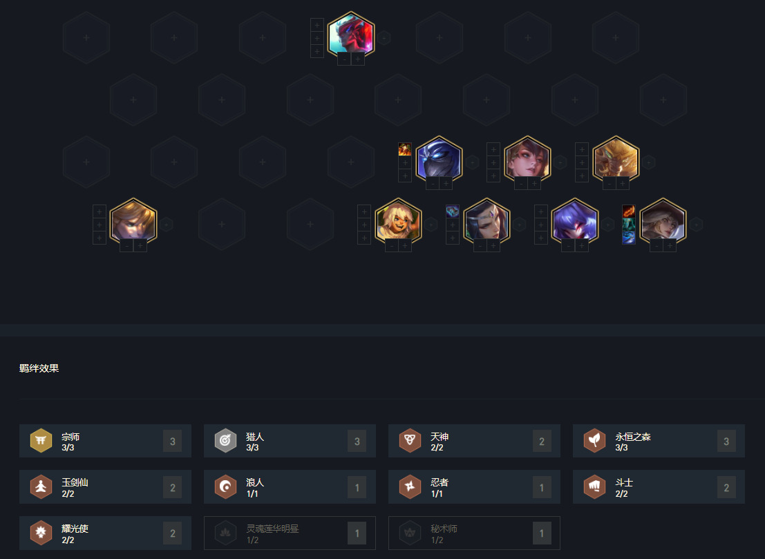 本周统计中猎宗强度大提升,赌狗阵容减伤,猎宗变的强势,且猎宗后期变种比较多,如最常规5猎3宗,耀光猎宗、森林猎宗、天神猎宗、4秘猎宗均可看后期对局情况选择变阵,吃分与吃鸡强度均超高。