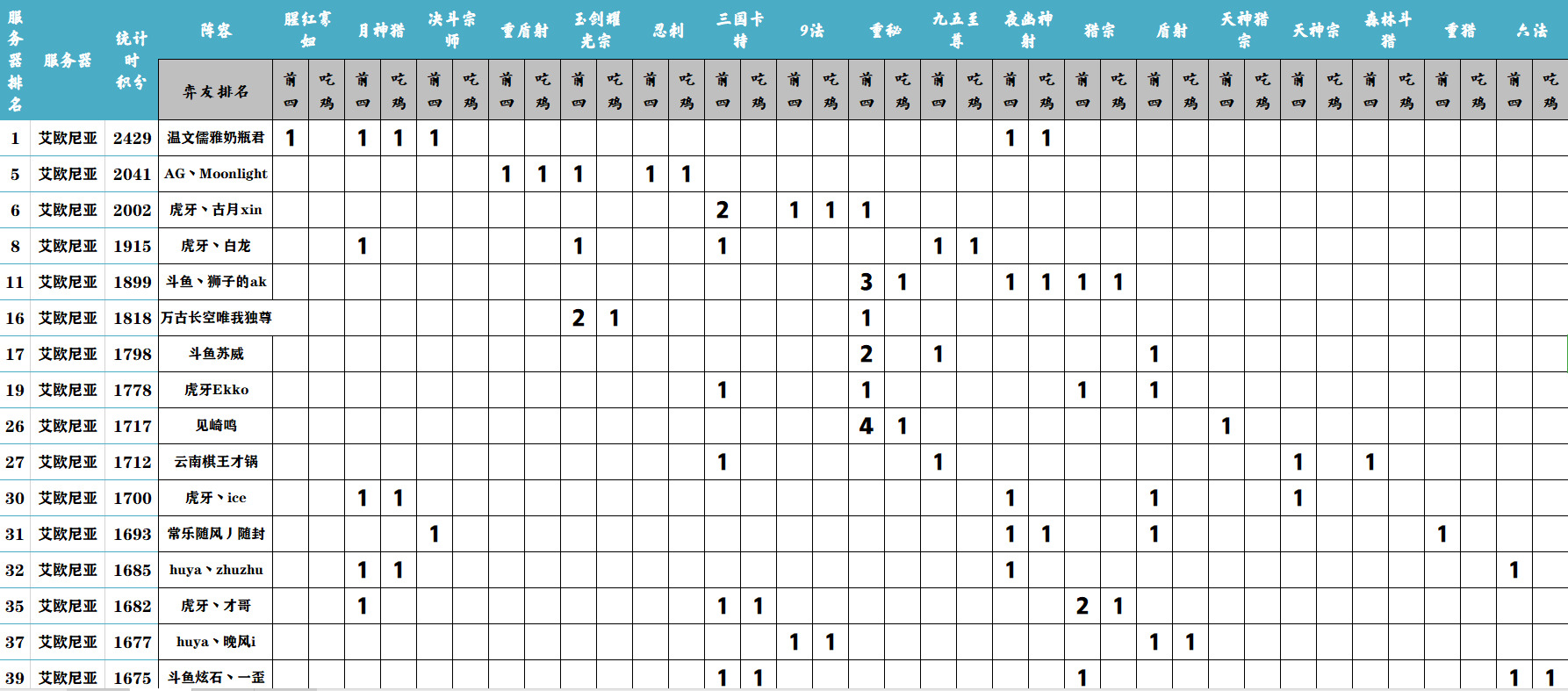 · 只统计艾欧尼亚服务器排名前30名玩家,无对局场次,或不够5场排位赛,名次顺延。
