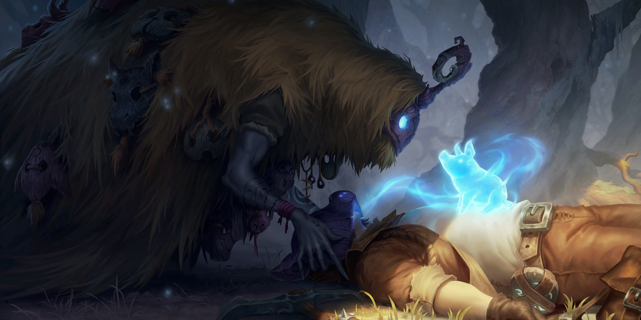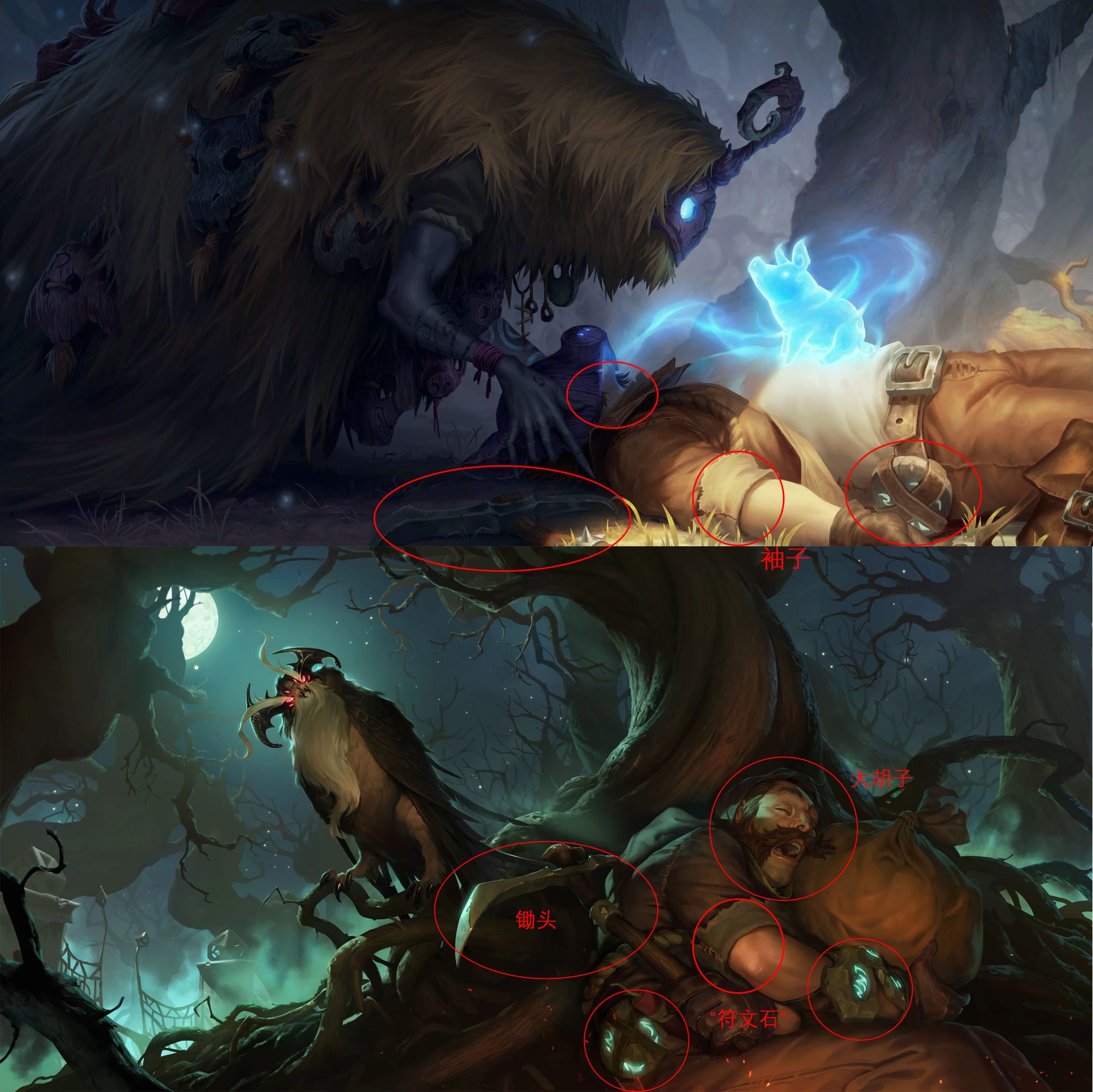 可以从锄头、腰间的刻有符文的石头、袖子可以判断出来,所以尸体的猪猪面具下的毛发不是头发而是胡子。所以新画中的场景就在暗影岛,千珏作为背景故事中的死神,和暗影岛的玩法风格也很契合,所以大胆猜测新系列中,暗影岛的新英雄就是千珏。