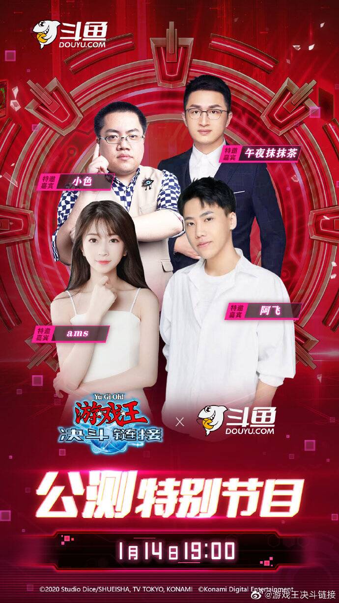 【斗鱼公测直播节目】《游戏王:决斗链接》将于1月14日正式公测,在公测当晚,斗鱼人气主播 @不是毒奶色我是专业解说黄旭东 、@阿飞-胡雪飞 、@叫我Ams就好了 、@午夜吊吊茶 将一起来聊天、开包、打牌,battle。落败者将受到“严厉”的惩罚!
