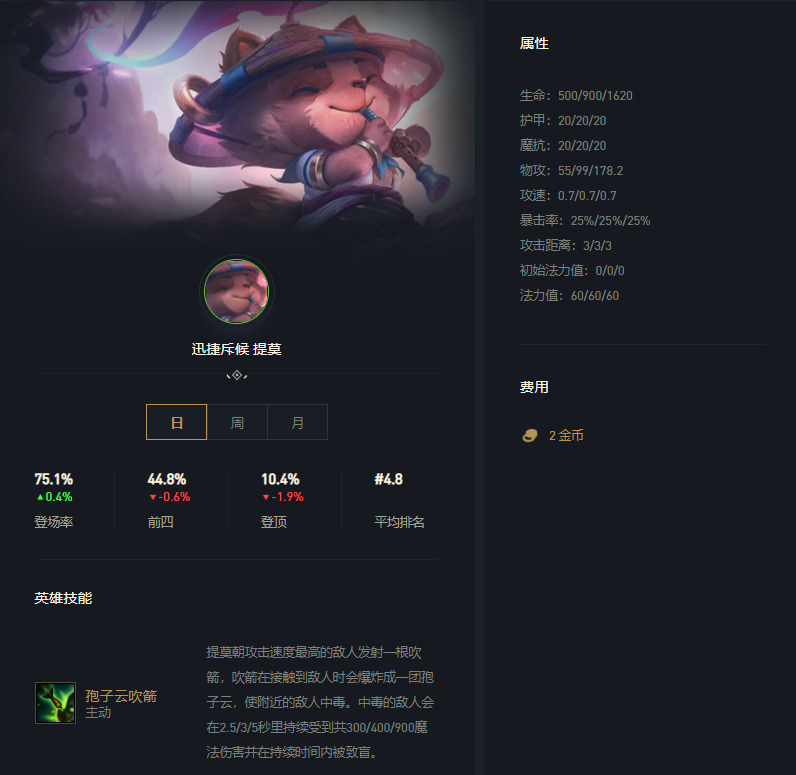 3星提莫技能900群伤,增加70%法强后技能伤害1530的群伤,在算上给予提莫鬼书的法强技能伤害达到恐怖的1665,在2射状态下叠加可秒版本大部分棋子。