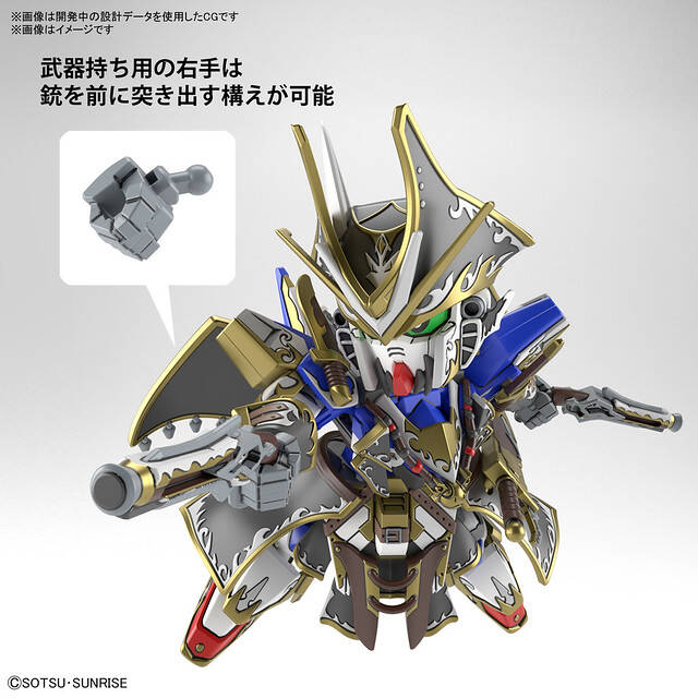 「SDW HEROES信长次代高达」拥有华丽的铠甲、非对称的披风造型,左肩大袖使用两层零件构成,右腕则为可动设计,可再现拔出名刀「压切长谷部」的姿势。此次剧中设定「戴上面具就能发挥隐藏能力」,信长也附有仿佛恶鬼般的透明材质面具、可动的热能鞭特效,再现魄力的战斗姿态。