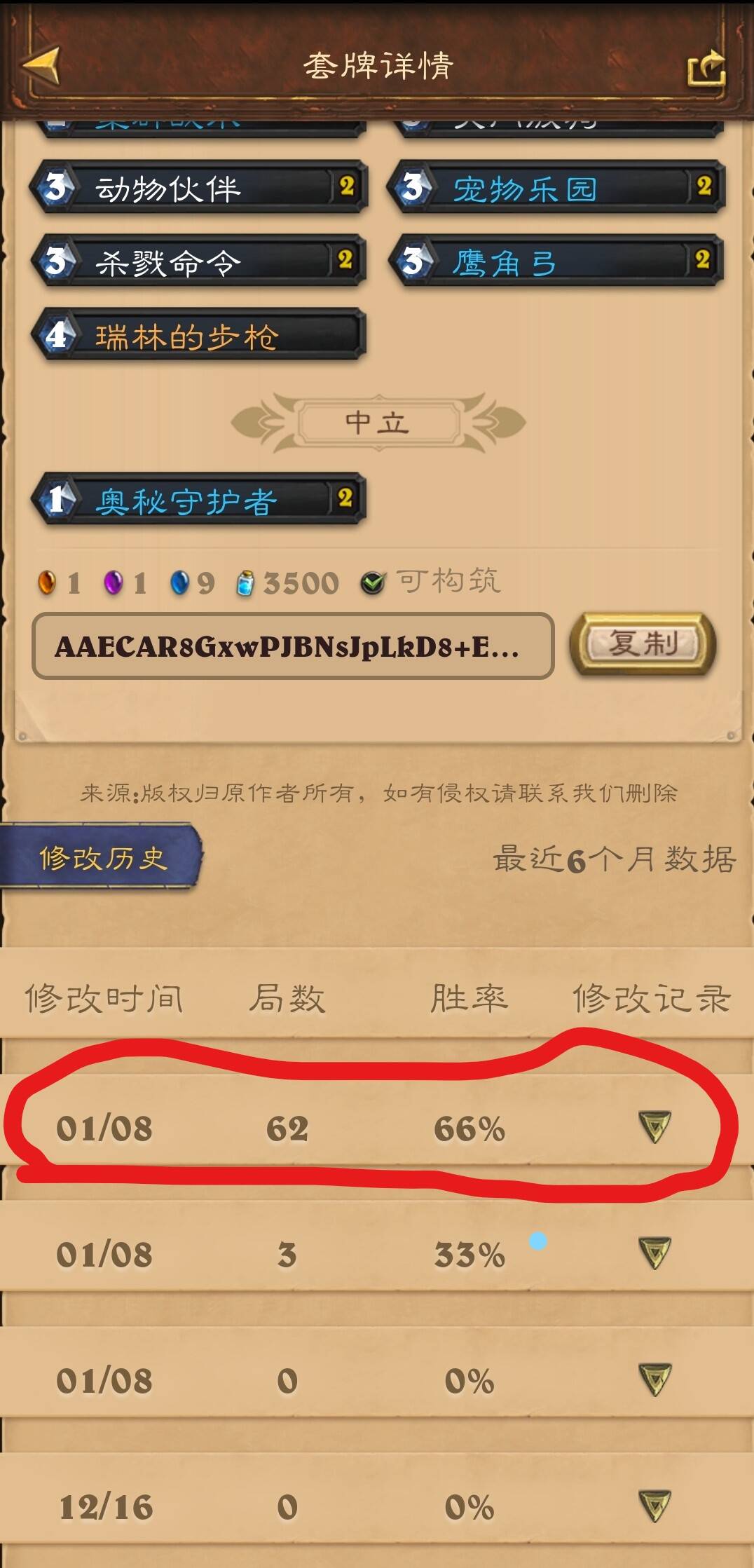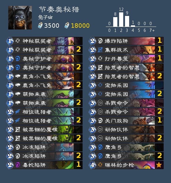 各位营地老哥好,我是兔子sir。(炉石ID Siruis#5524)。去年12月用奥秘贼上传说后我深感奥秘贼的无趣便试图用法师冲击1月传说,在被进化萨连续打破头之后选择光速删掉卡组。由于咽不下这口气,开始选择了用传统t7猎抓萨满上分,但抽一打一的无趣感和牌序不好时的无力感让我决定改良t7,做出一套还有点操作并不怎么吃牌序的猎人。于是,这套奥秘猎就这么诞生了,本月猎人我以整体62场(10星),66%的胜率从青铜10打到传说,从钻五至传说的胜率有百分之80%。流水的t1,铁打的猎人,下面贴出卡组构筑以及对战战绩截图。