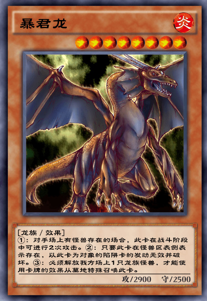 效果和名字一样暴力的卡片,①效果配合2900至高攻击力很容易清完对手的场面并打出成吨伤害,②效果不会被一些陷阱卡干扰或者除去,稳扎稳打的效果,非常符合暴君龙这个名字。