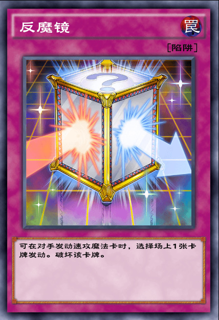 游戏王里很少有那种发动条件简单又能一换一的卡片,反魔镜算是一个,但它更算是根据环境来投入的卡片。这个环境里,圣衣、敌操和半减这样高浓度的速攻魔法,为反魔镜的发动打下了充足的条件,而且连锁上述卡片所带来的收益也不小,但是终究是针对环境的卡片,也是需要根据战术酌情投入。