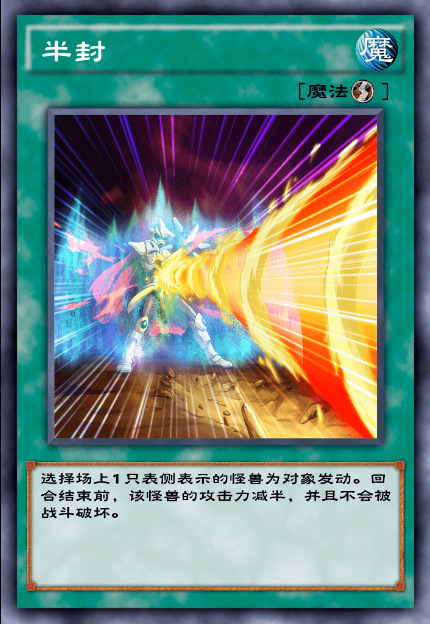 攻击力减半的速攻魔法,不会被战斗破坏。比起对方场上全怪减半攻击的镜壁来说,单体怪兽减半显得不怎么厉害,但是0LP支付、速攻魔法的特性和其不被战破的效果补充了它的不足。在对方回合,可以单点自己的怪兽撑过战斗阶段;在自己回合,当对方场面壮大,可以单点对方一只怪兽形成突破口,因为不会被战斗破坏,可以让自己的战力都倾泻在减半的怪兽身上打出伤害,是一张比较灵活的卡片。