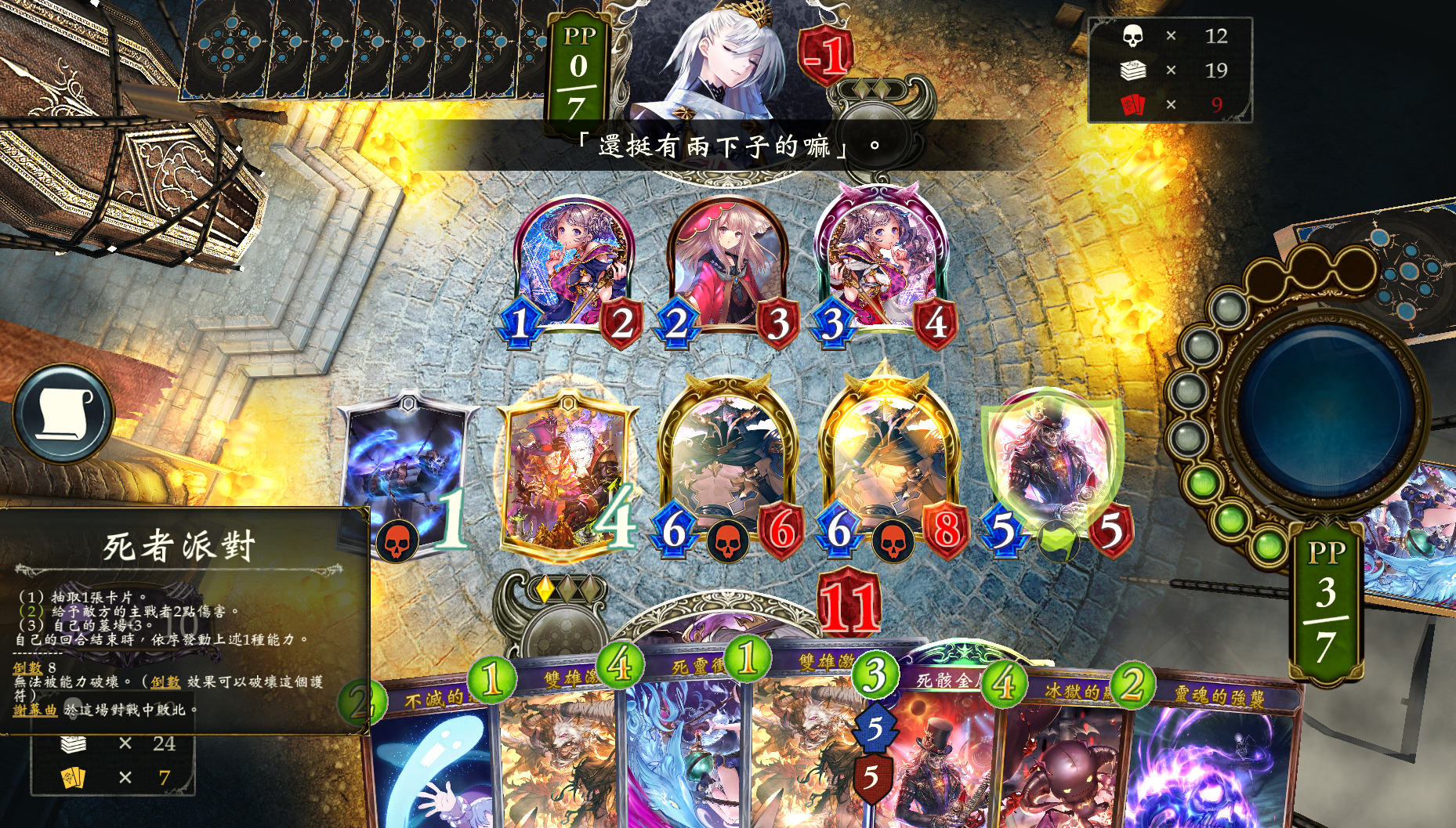 死者派对可以过牌,制造伤害,并为冲击堆墓。在第2~3回合使用的派对,可以在第7回合打出总计4点直伤,配合2张巴萨拉卡、冲击和进化点,便能打出20点分段斩杀。